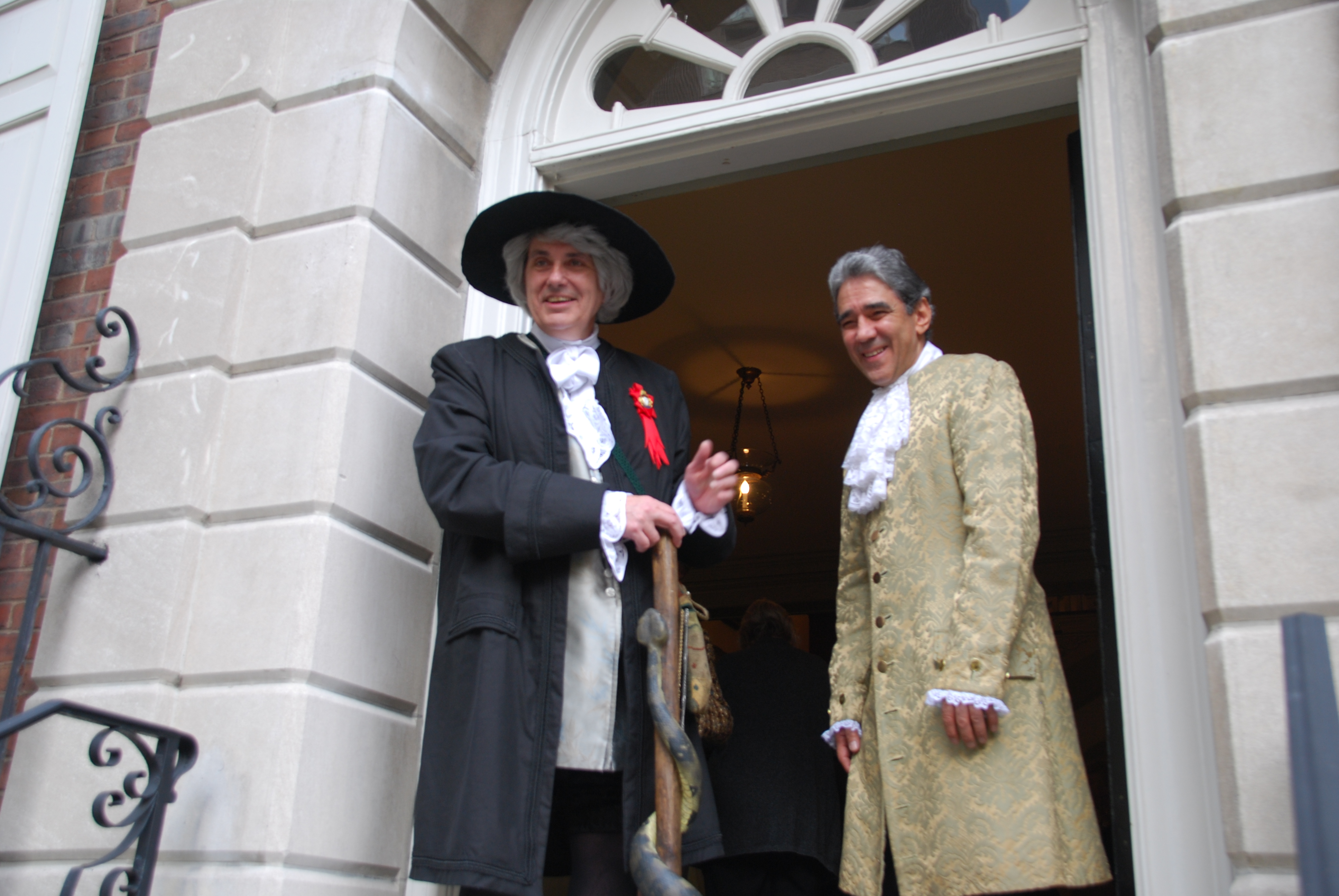 John Bartram appears as the welcoming host with the doorman at the the house of the American Society of Colonial Dames.